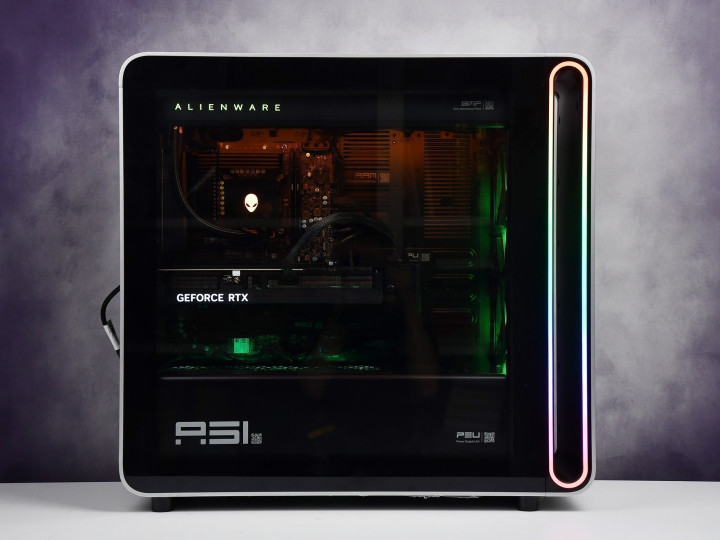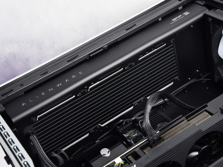 通过后方的快拆开关,我们可以轻松卸掉Area-51的侧面板,不过因为是纯玻璃面板,所以一定要非常小心避免磕碰。从侧面看过去,Area-51的内部设计非常讲究,360冷排风扇左侧面板上设计了ALIENWARE品牌logo,并且带有背光。下方电源左侧印有特型设计的“A51”产品系列名称,整体的设计感拉满,情绪价值给的非常到位。