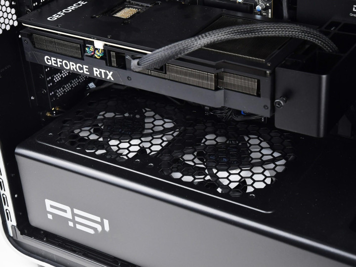 显卡方面,这款机器搭载了一块定制的GeForce RTX 5080,三风扇设计,右侧配有黑色的金属固定支架,供电是标准的16pin。