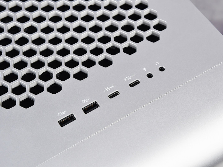 Area-51靠近前端的顶部区域配置了1个耳机+1个麦克风插孔,2个USB Type-C 10Gbps接口,均支持充电,另外还配有2个USB Type-A 5Gbps接口,方便用户传输数据、外接扩展。