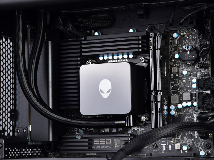 CPU散热器水泵上特别定制了外星人头像logo,开机后会呈现白色背光。内存没有LED灯带,因为它使用的是金士顿倍受好评的Fury Beast内存条,稳定性和兼容性绝佳。