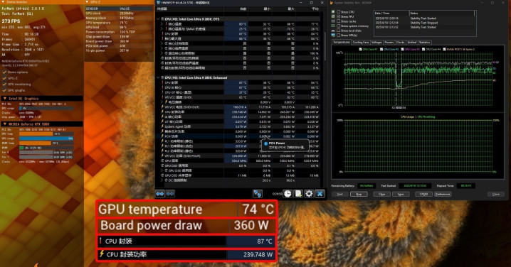 AIDA 64+Furmark CPU+GPU双烤机测试中,CPU封装温度仅为87℃,封装功率239.7W;显卡总功率360W,温度仅74℃,两大核心硬件总功耗释放高达600W的情况下,温度都能压到90℃以内,说明Area-51的散热系统确实相当给力。实际体验下来,在日常应用中这款产品的稳定性极高,而且风扇噪音非常小。