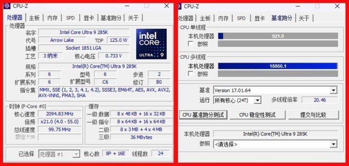 规格方面,酷睿Ultra 9 285K采用24核24线程设计,睿频加速最高为5.7GHz,基础TDP为125W,最大TDP为250W。CPU-Z单核和多核性能分别为921.9以及18866.1,这个分数与首发时的测试分数一样,说明Area-51的散热设计足够出色,并未影响到这颗处理器的性能跑分,总体功耗释放也足够充分。