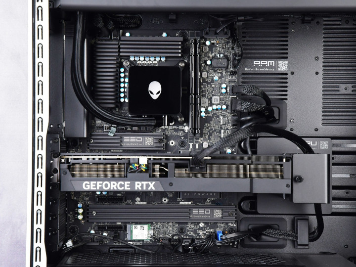 Area-51内部以黑色配色为主,主板采用了黑色PCB,机箱内壁也是黑色漆面喷涂,水冷头、硬盘散热片、内存装甲等等都是纯黑配色,与银色外壳以及开机后的白色背光形成鲜明对比。